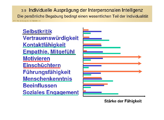 Abb. 1: Multiple Intelligenzen. Die klassische Definition der Intelligenz als der Fähigkeit zur Problemlösung und zum Umgang mit komplexen Zusammenhängen bezog sich ausschließlich auf den sprachlichen und mathematischen sowie auf den Bereich des räumlichen Denkens (obere Hälfte der Abb.). Es ist wohl ein Verdienst Gardners, intelligente Handhabung auch bei nicht rationalen (verstandesmäßigen) Reaktionen des Gehirns aufgezeigt zu haben. Längsschnittuntersuchungen zu Ergebnissen mit Intelligenztests wiesen ihm den Weg. Vielfältige Befunde zum Beispiel aus der Pathologie schienen seine Hypothese von einer multiplen Intelligenz (MI) zu stützen. Sie können allerdings auch durch eine übergeordnete intelligente Querschnittsfunktion (g--Faktor) erklärt werden. Zu ihren parallelen Feldern zählt auch die emotionale Intelligenz, und zwar in einer intrapersonalen und einer interpersonalen Form. Wichtigste intrapersonale Funktion ist die Sebstbeherrschung. |