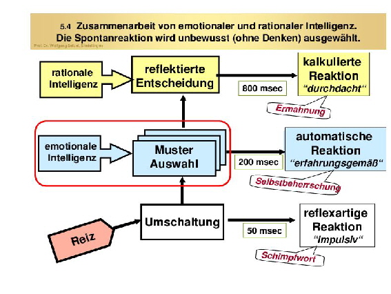 1. Rationale und auch emotionale Intelligenz? Der Begriff “Intelligenz” wird eigentlich als eine Funktion des Verstandes definiert, bedarf somit des Bewusstseins. Da im Alltag und in der Psychologie früherer Jahrzehnte der Verstand das Gegenteil zum Gefühl ist, und da Gefühle unbewusst auftreten, erscheint sehr vielen schon der Begriff der “emotionalen Intelligenz” als ein Widerspruch in sich, ein Oxymoron wie etwa “Feuerwasser”. Schon daher wird die Theorie einer emotionalen Intelligenz von vielen bekämpft. Man kann sich die Intelligenz vorstellen als eine kompetente Suchfunktion, die aber (anders als Google) die ermittelten Suchergebnisse mit den Zielbedingungen vergleicht, dann die vermutlich optimale Alternative auswählt und diese schließlich im sog. Vorstellungsraum präsentiert. Im emotionalen Bereich könnte das unbekannte, zu lösende Problem (zum Beispiel während eines Streitgesprächs) die psychische, gefühlsmäßige Reaktion auf eine unbedachte Äußerung des Gegenübers sein. Da dann der Verstand auf den rationalen Inhalt dieser Äußerung reagieren muss, also mit Überlegungen beschäftigt ist, muss die zweckdienliche gefühlsmäßige Reaktion unbewusst ausgewählt werden. Das Resultat, also im Gespräch auch “automatisch” den richtigen Ton zu finden, um den Partner nicht zu verärgern, kann durchaus intelligent erscheinen und eventuell auch sein. Die Intelligenz im emotionalen Bereich müßte dann aber ohne die bewusste Aufmerksamkeit auskommen. Salovey und Meyer haben 1990 aus derartigen Überlegungen heraus den Begriff einer emotionalen Intelligenz propagiert. Ähnliche Überlegungen gab es schon vorher. Nach dem weltweiten Erfolg des Bestsellers von Goleman (1995) mit dem gleichen Titel erreichten Gedankengänge in dieser Richtung besonders große Zustimmung in der Pädagogik und in der Öffentlichkeit. Ob man den herkömmlich für rationale Aufgaben des Verstandes (Denken, Planen, Kalkulieren usw.) reservierten Begriff “Intelligenz” gemäß dieser Erkenntnis auch auf andere Hirnfunktionen (hier also die Emotionen) ausdehnen soll, ist in der Wissenschaft noch strittig. Aber man fand keinen besseren Begriff.